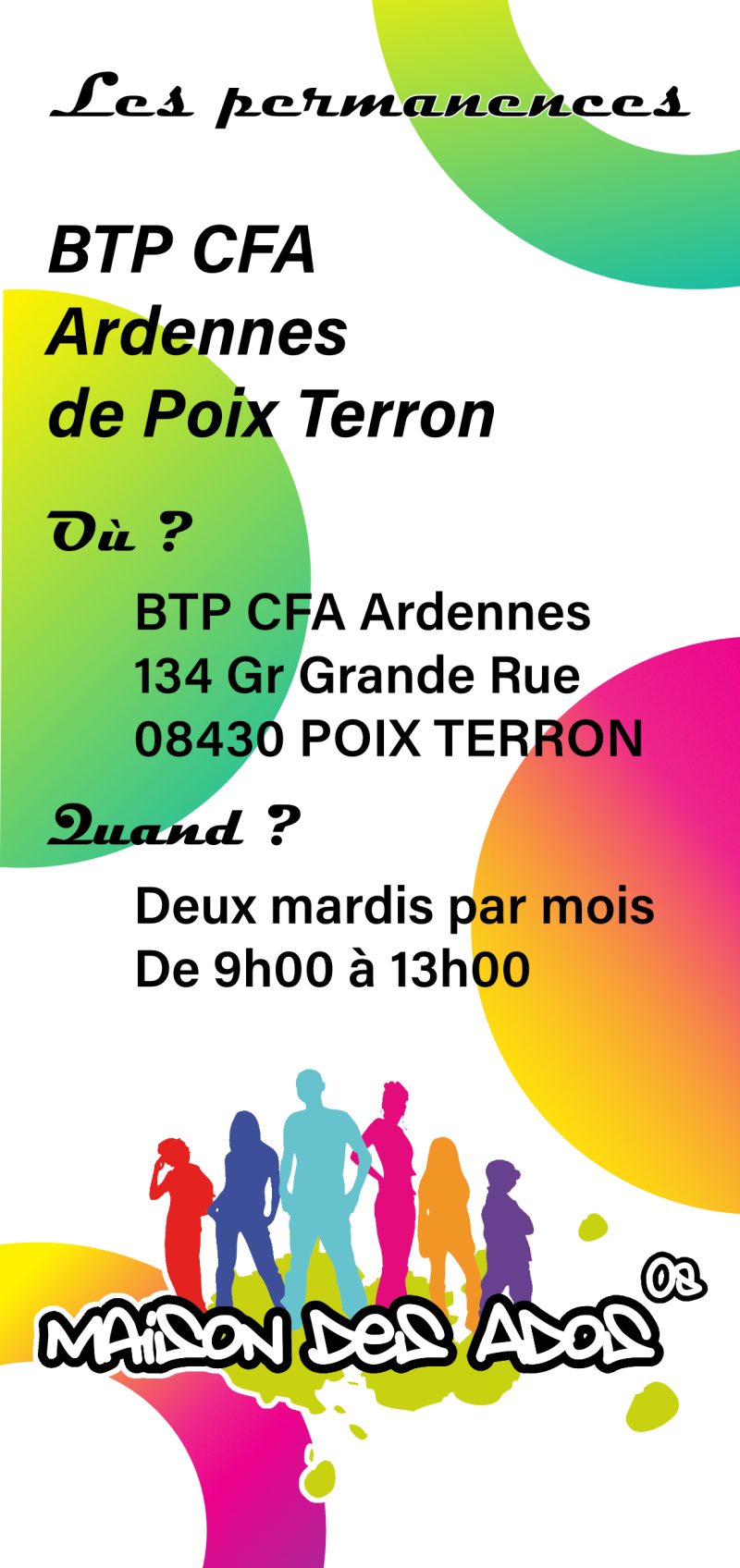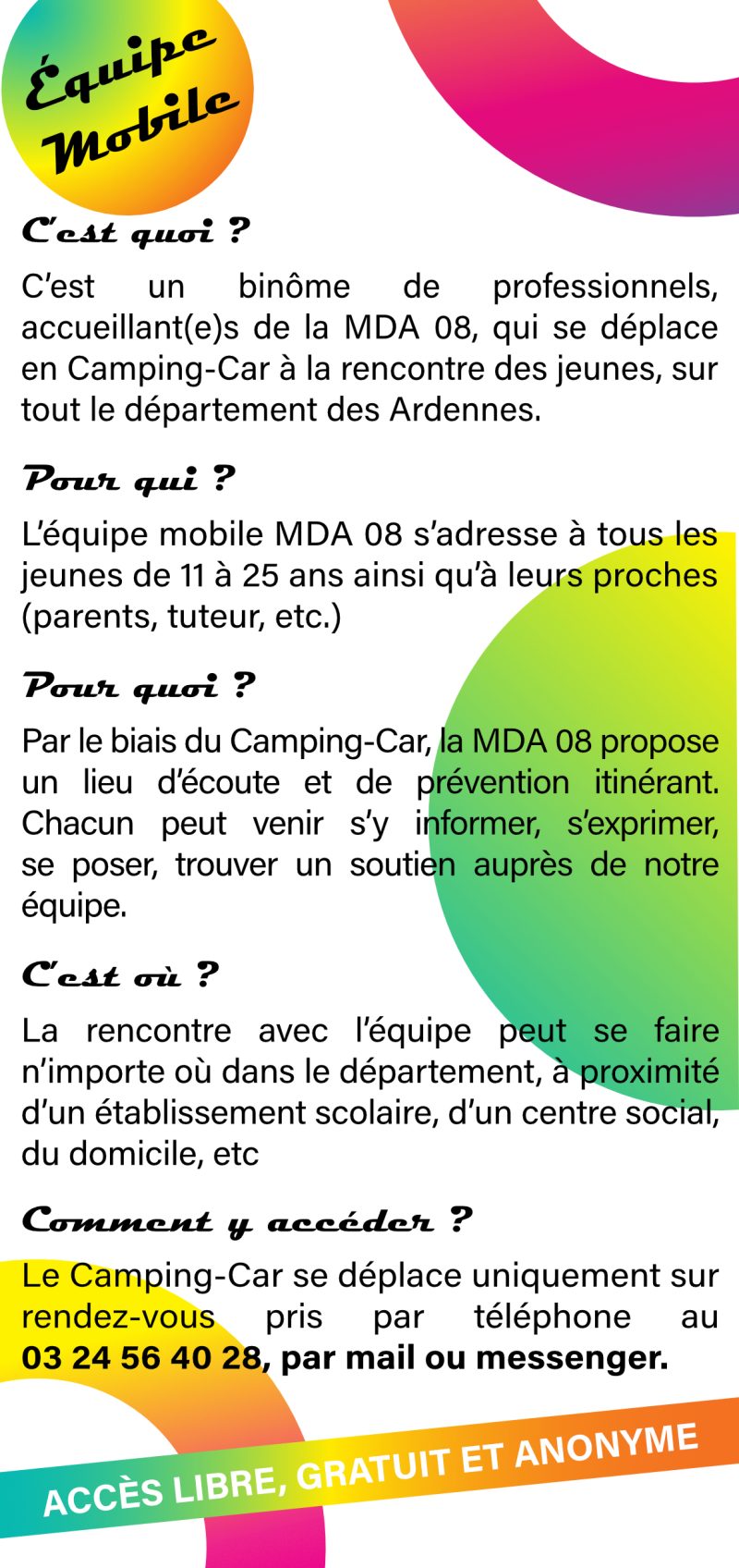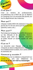Sur Charleville-Mézières, nous t’accueillons avec ou sans rendez-vous. Avec rendez-vous, tu rencontreras des accueillants sur un créneau d’environ une heure. Sans rendez-vous, nous te recevons le lundi, le mercredi et le jeudi. Ensuite, si tu n’es pas sur Charleville-Mézières, nous pouvons venir te rencontrer proche de chez toi grâce à notre camping-car qui sillonne le département plusieurs fois dans la semaine.